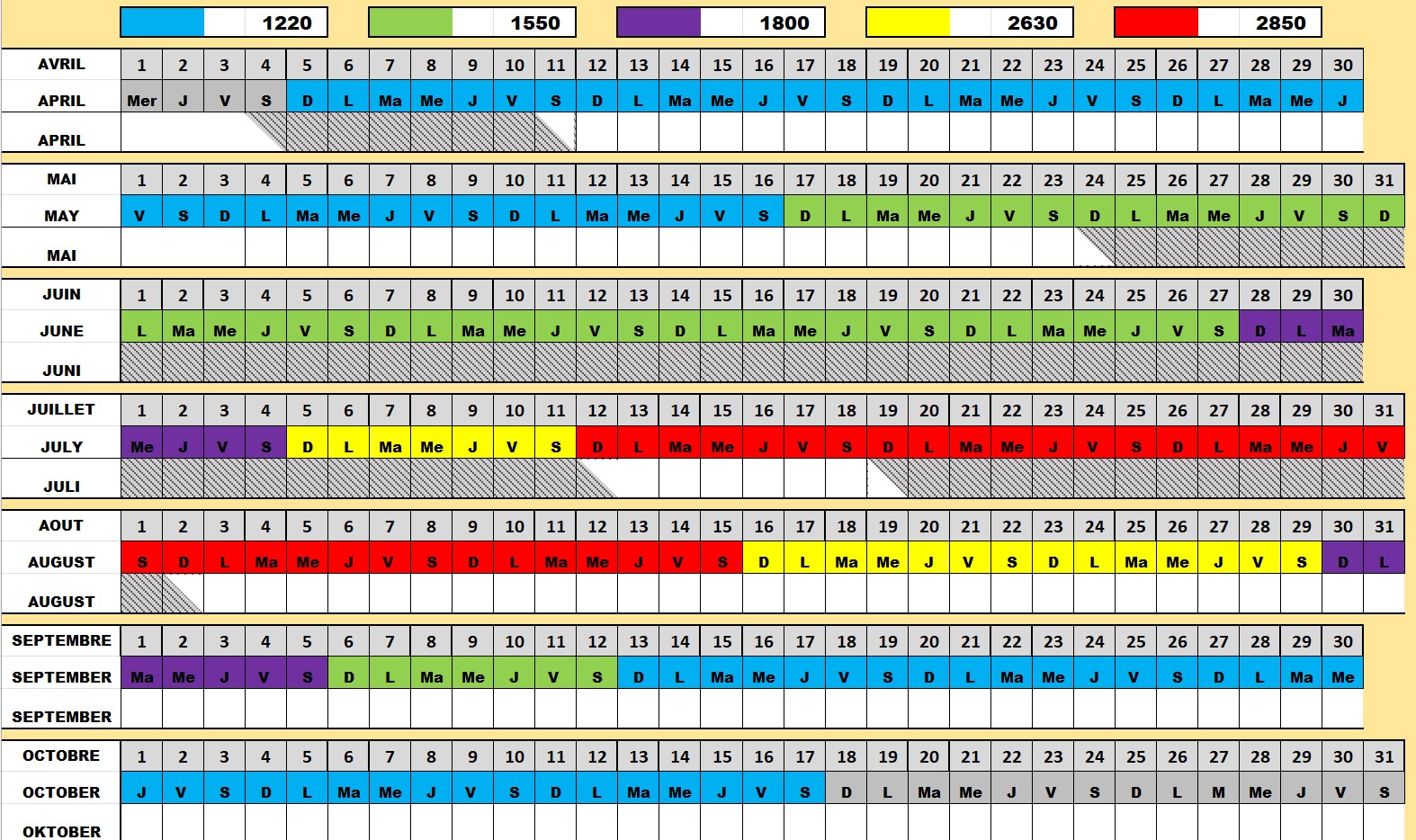Zone blanche : période disponible – Zone hachurée : période indisponible ou occupée.